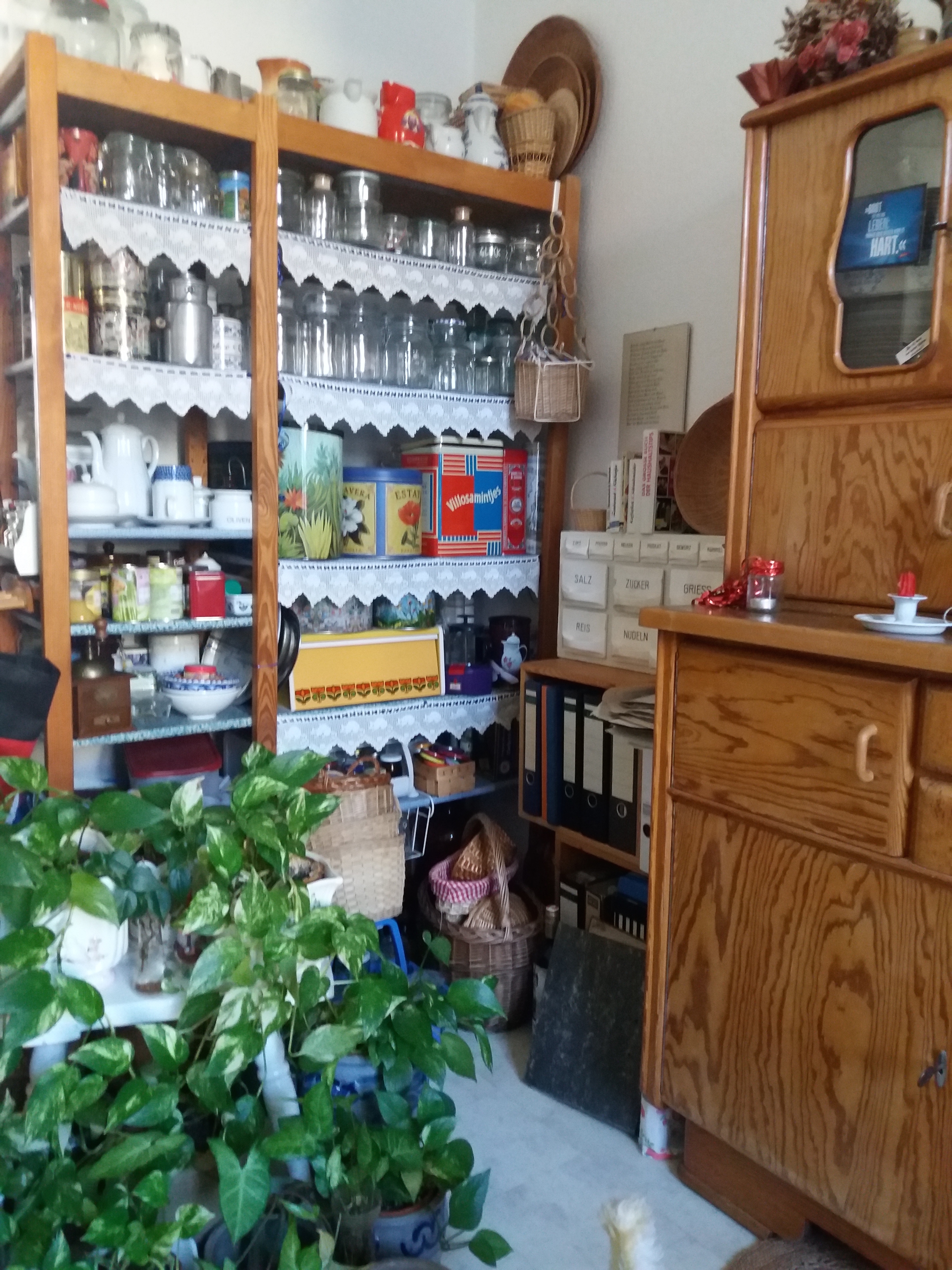 Ich glaube, das Wort gab es damals noch gar nicht, als ich vor einem Trödelladen mit einer Dame ins Gespräch kam und ihr sagte, dass ich nach einem Nähtischchen suchte. Ich hab so was sicher, meinte sie und lud mich in ihre Wohnung ein. Ich konnte kaum glauben, was ich da sah. Die Räume waren vollgestopft mit Möbeln, auf den Möbeln standen weitere Möbel oder andere Behältnisse. Zwischen den Möbeln gab es nur ganz schmale Pfade, denn vor den Möbeln waren Garderobenstangen voller Kleidung. Der schmale Weg endete in einer Sackgasse. Hier stand ein breites Bett, dahinter und daneben kein Platz. Auf dem Bett stand ein Teller mit einer angebissenen Stulle. – Die Dame erzählte, dass wegen eines Wasserschadens Leute in ihre Wohnung mussten. Die hatten Bedenken wegen der Statik geäußert. „Die sagten, ich hätte zu viel Sachen, finden Sie, dass ich zu viele Sachen habe?“ – Unter dem Eindruck des Gesehenen erzählte ich meiner Freundin Karin davon. „Gruselig, unheimlich, gespenstisch…“ Ich konnte mich gar nicht beruhigen. „Was regst du dich denn so auf“, fragte Karin, „in ein paar Jahren sieht es doch bei dir genauso aus.“