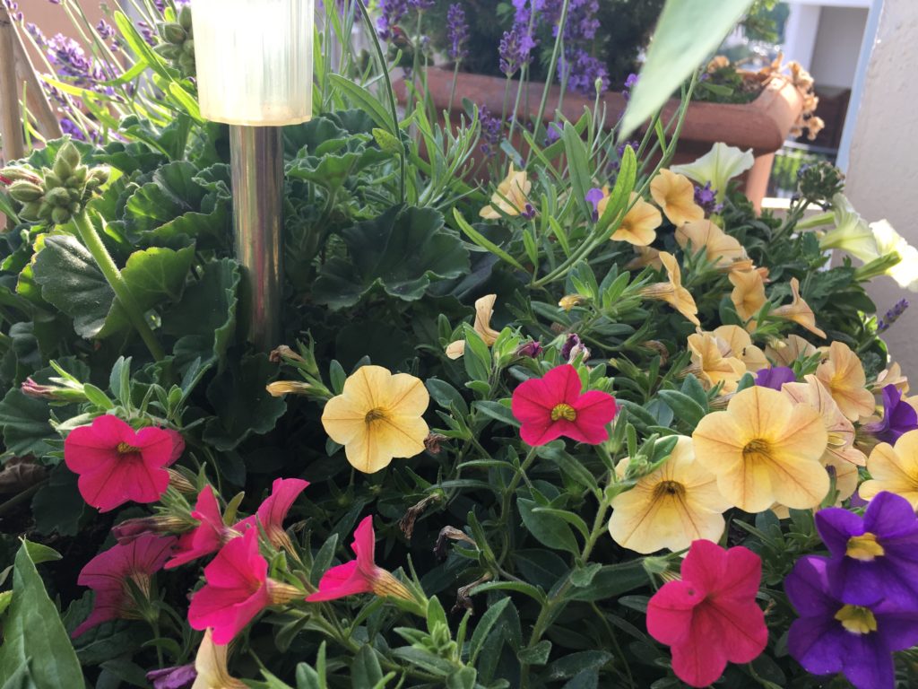 Blütenpracht bei Aldi im Sonderangebot, 6er-Tray für 1.99 Euro. Hab ich gleich gekauft. Nach Aldi komme ich noch am Blumenstand in der Passage vorbei. Da gibt es auch noch schöne Sachen. Na, wenn ich schon mal hier bin. Zwei Töpfe weißblühend. Es wird sich schon ein Plätzchen finden. Vier aus dem Sechserpack passen noch in eine Ecke des Balkons, die man überhaupt nicht sieht, weil anderes Grünzeug sie verdeckt. Das ist so sinnvoll wie das Staubbeseitigen auf dem Schrank. Es gibt noch eine Ecke, aber da komme ich nicht ran, weil zu viel davor steht. Es handelt sich wohl um eine Balkonsucht.